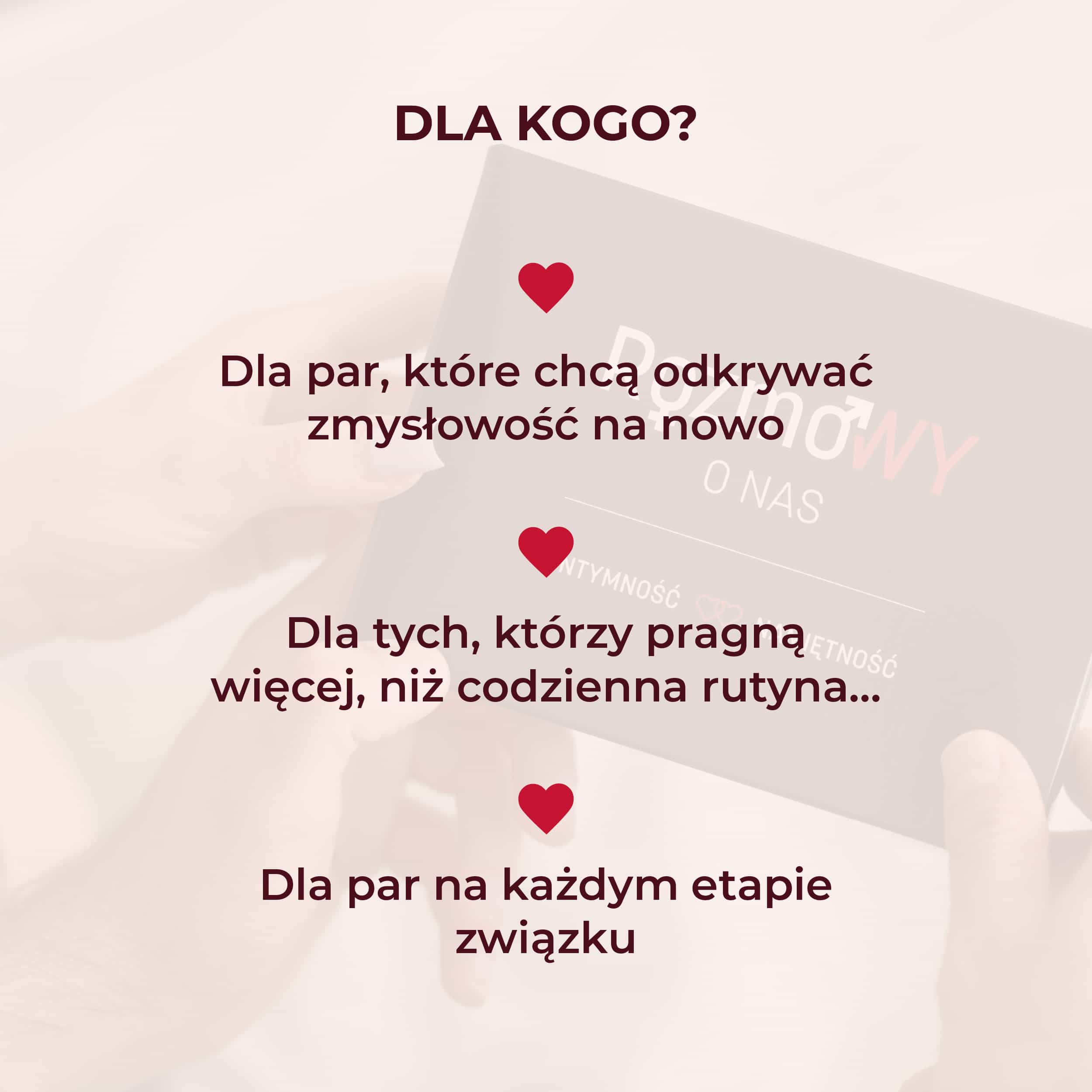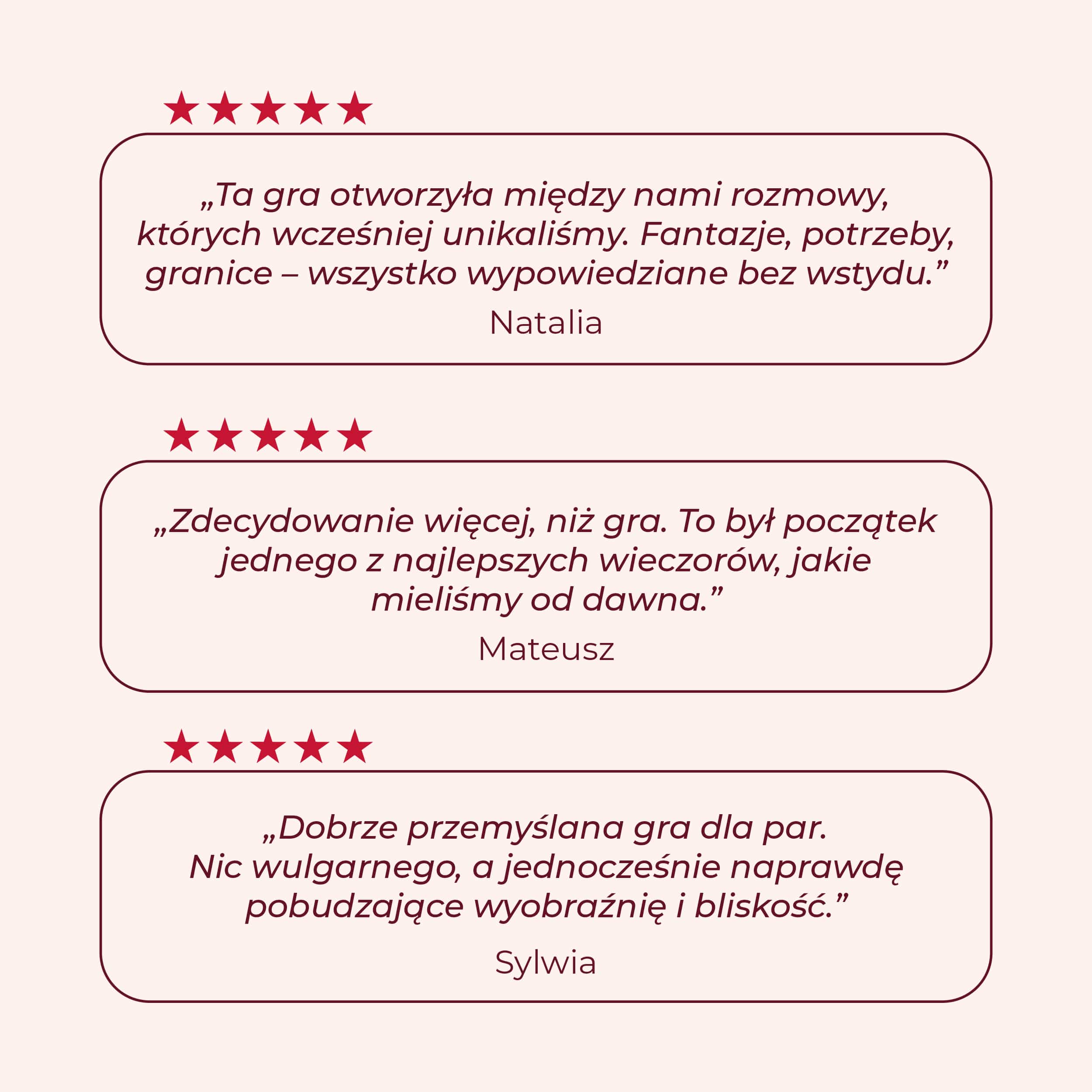 Wszystkie dotyczą spraw intymnych, wpisanych w strukturę związku – Waszych spraw. Dzięki nim wypowiecie to wszystko, co czasem ciężko ubrać w słowa. Oto gra dla par, które chcą wkroczyć w kolejny etap relacji – głębszy, dojrzalszy, bardziej namiętny.
